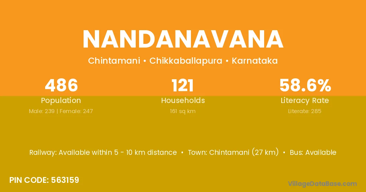 Chintamani (27 km) is the nearest town to Nandanavana village for major economic activities and is located approximately 27 km away.