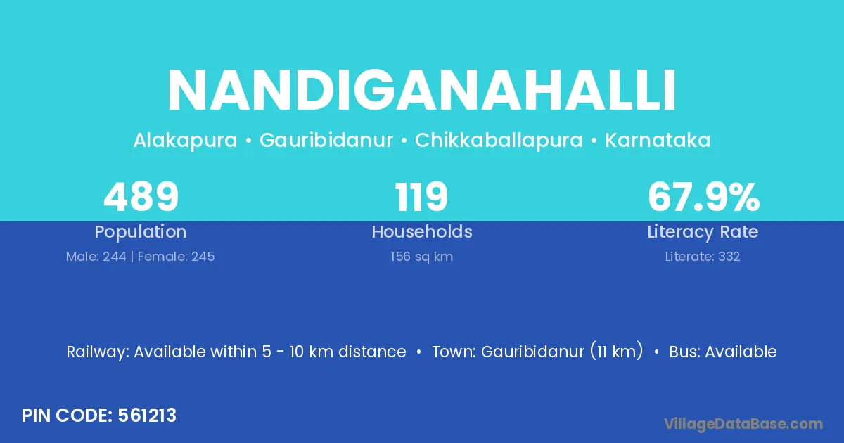 Chintamani (15 km) is the nearest town to Nandiganahalli village for major economic activities and is located approximately 15 km away.