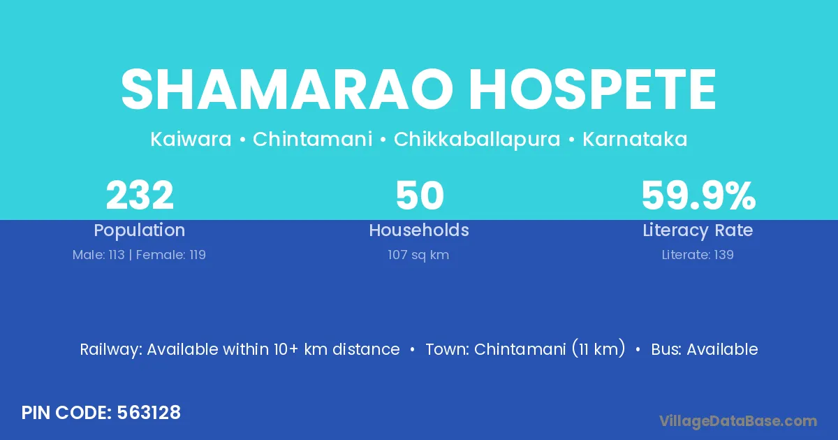Chintamani (11 km) is the nearest town to Shamarao Hospete village for major economic activities and is located approximately 11 km away.