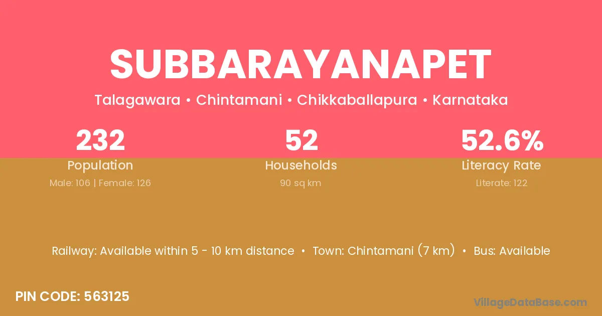 Chintamani (7 km) is the nearest town to Subbarayanapet village for major economic activities and is located approximately 7 km away.