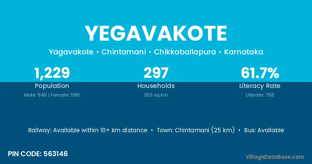Chintamani (25 km) is the nearest town to Yegavakote village for major economic activities and is located approximately 25 km away.