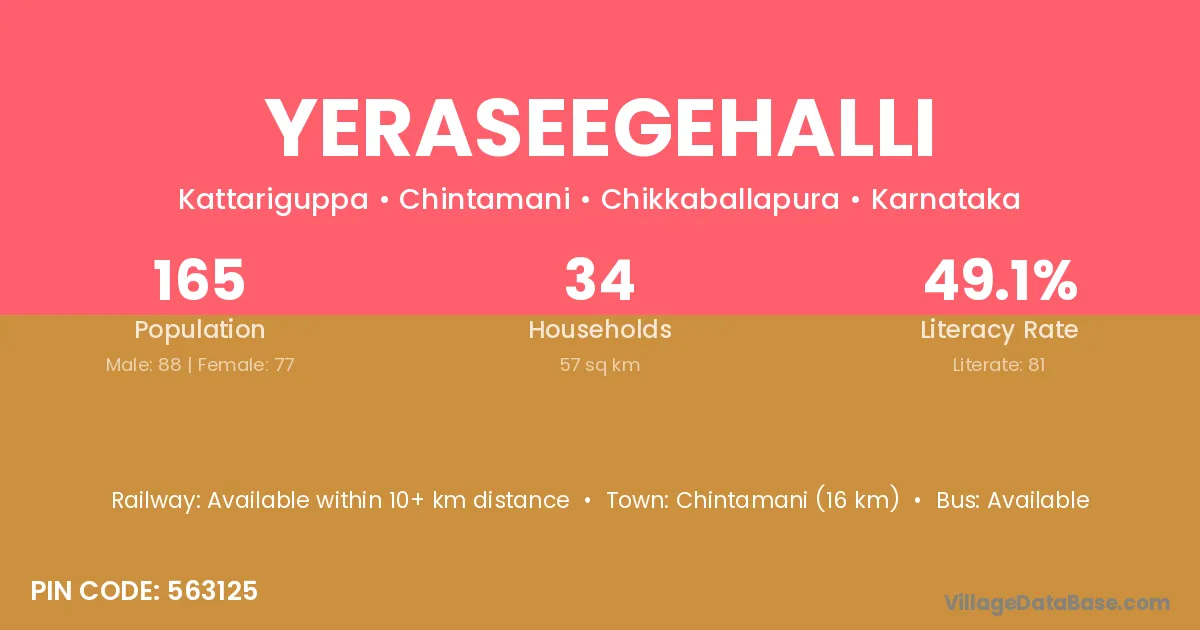 Chintamani (16 km) is the nearest town to Yeraseegehalli village for major economic activities and is located approximately 16 km away.