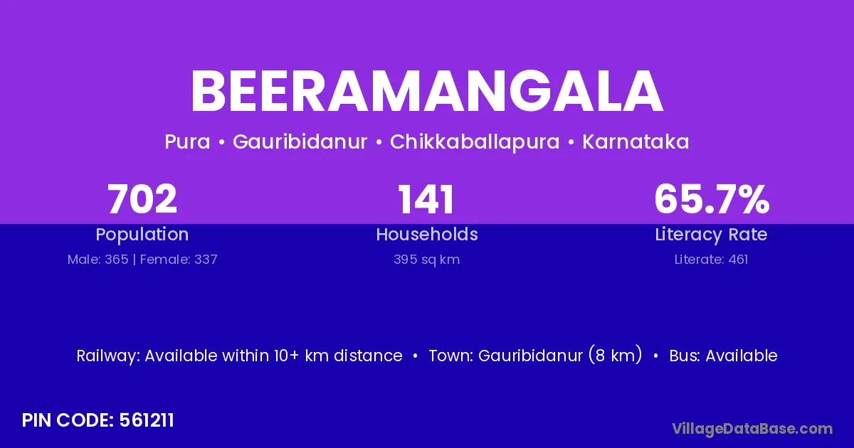 Gauribidanur (8 km) is the nearest town to Beeramangala village for major economic activities and is located approximately 8 km away.