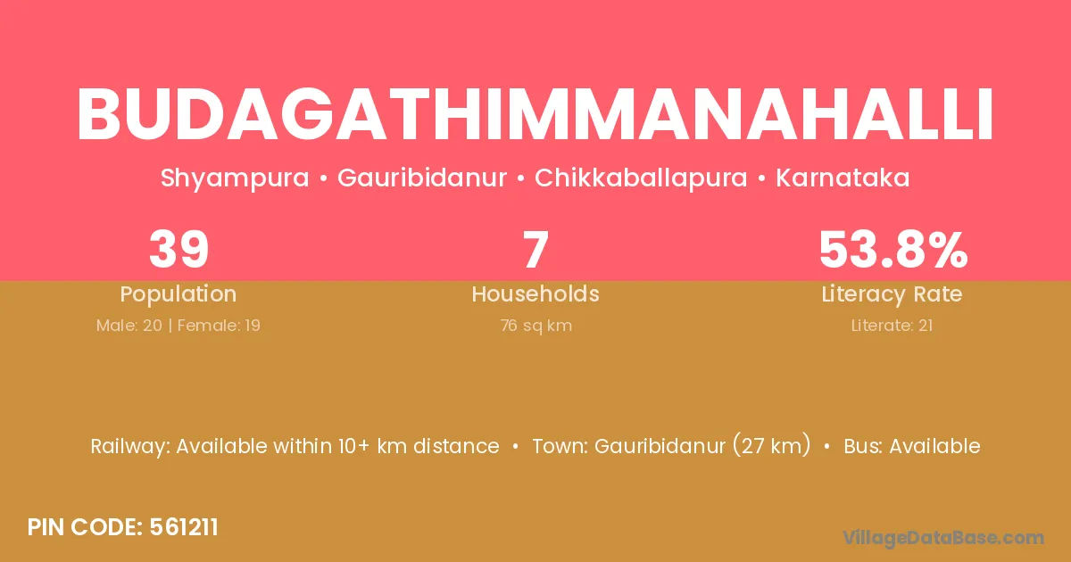 Budagathimmanahalli village has a total population of 39 people, of which 20 are males and 19 are females.