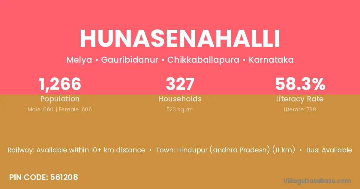 Hunasenahalli village has a total population of 1,266 people, of which 660 are males and 606 are females.
