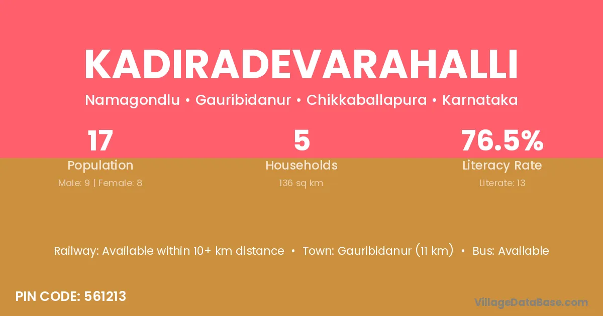 Kadiradevarahalli village has a total population of 17 people, of which 9 are males and 8 are females.
