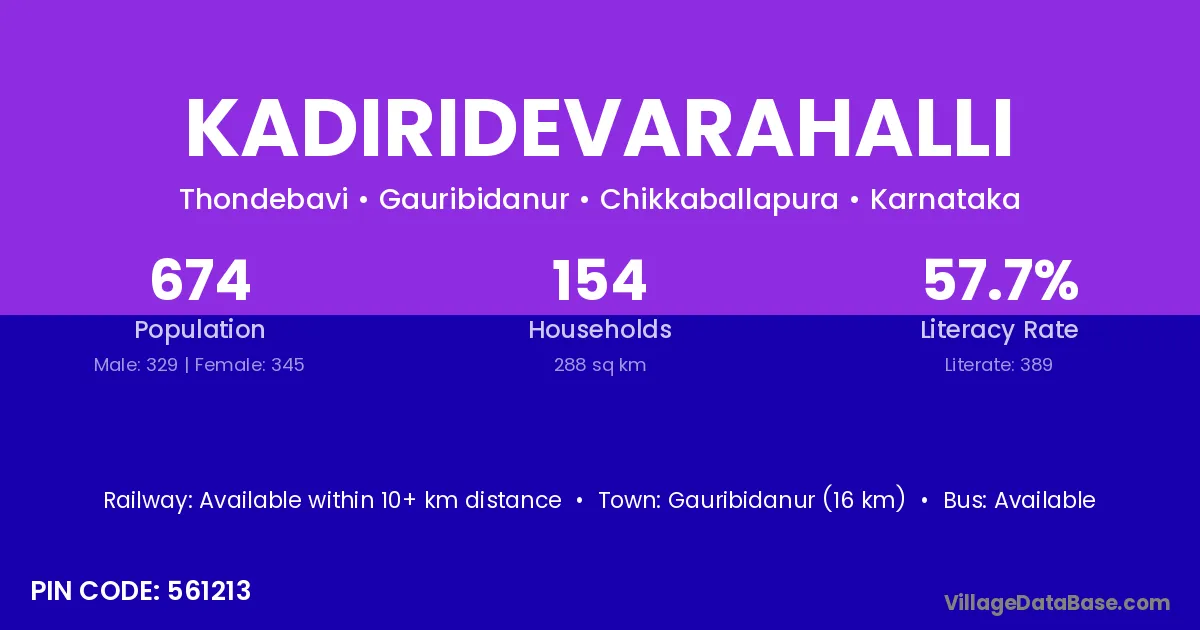 Kadiridevarahalli village has a total population of 674 people, of which 329 are males and 345 are females.