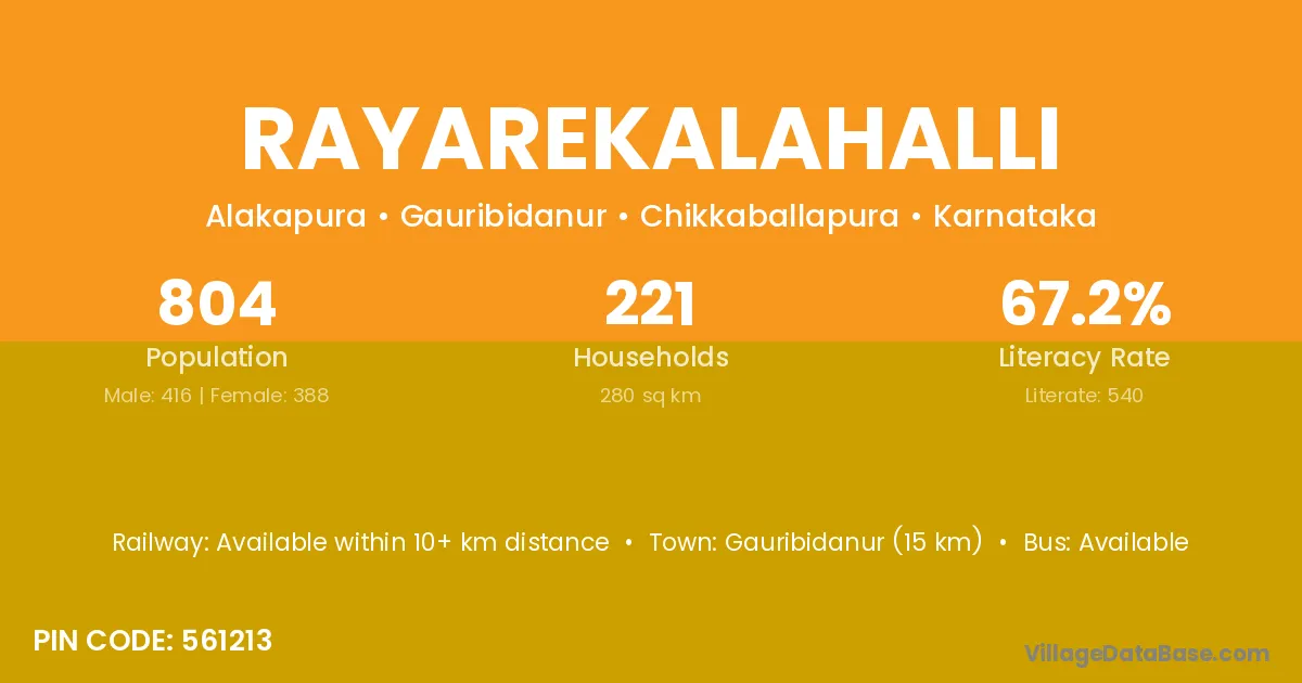 Rayarekalahalli village has a total population of 804 people, of which 416 are males and 388 are females.