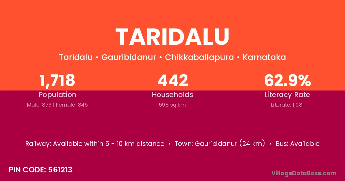 Gauribidanur (24 km) is the nearest town to Taridalu village for major economic activities and is located approximately 24 km away.