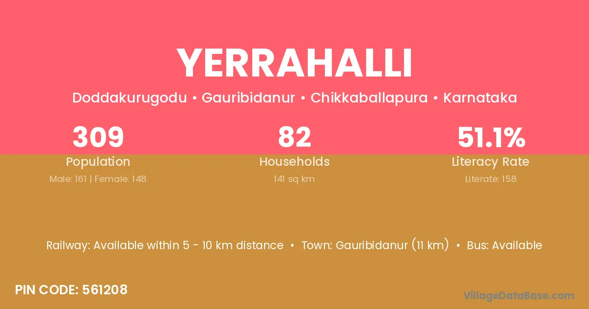 Gauribidanur (11 km) is the nearest town to Yerrahalli village for major economic activities and is located approximately 11 km away.