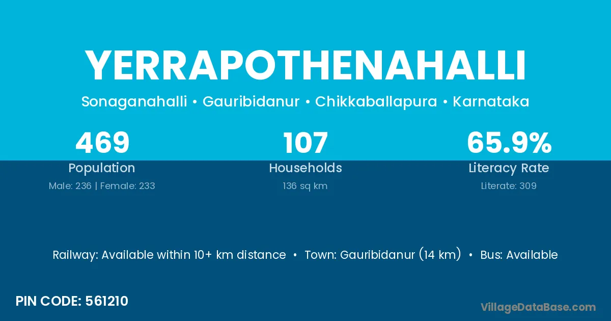 Yerrapothenahalli village has a total population of 469 people, of which 236 are males and 233 are females.