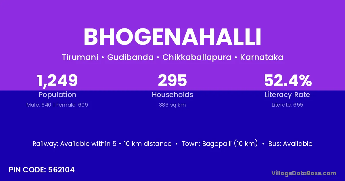 Bagepalli (10 km) is the nearest town to Bhogenahalli village for major economic activities and is located approximately 10 km away.