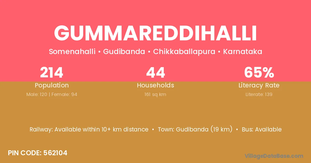 Gummareddihalli village has a total population of 214 people, of which 120 are males and 94 are females.