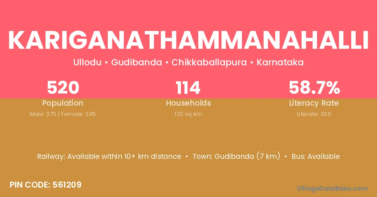 Gudibanda (7 km) is the nearest town to Kariganathammanahalli village for major economic activities and is located approximately 7 km away.