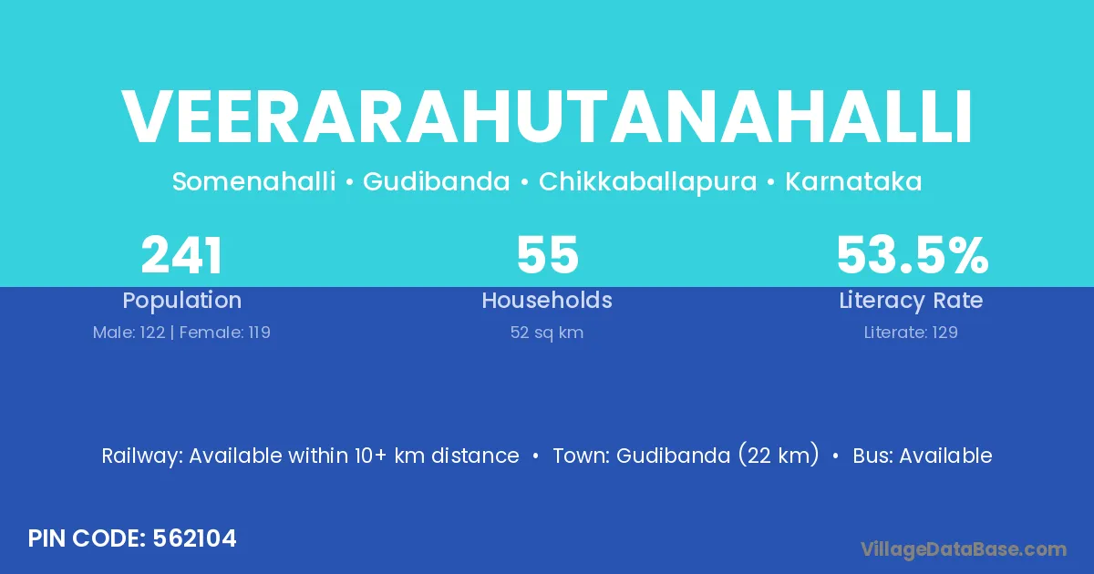 Gudibanda (22 km) is the nearest town to Veerarahutanahalli village for major economic activities and is located approximately 22 km away.