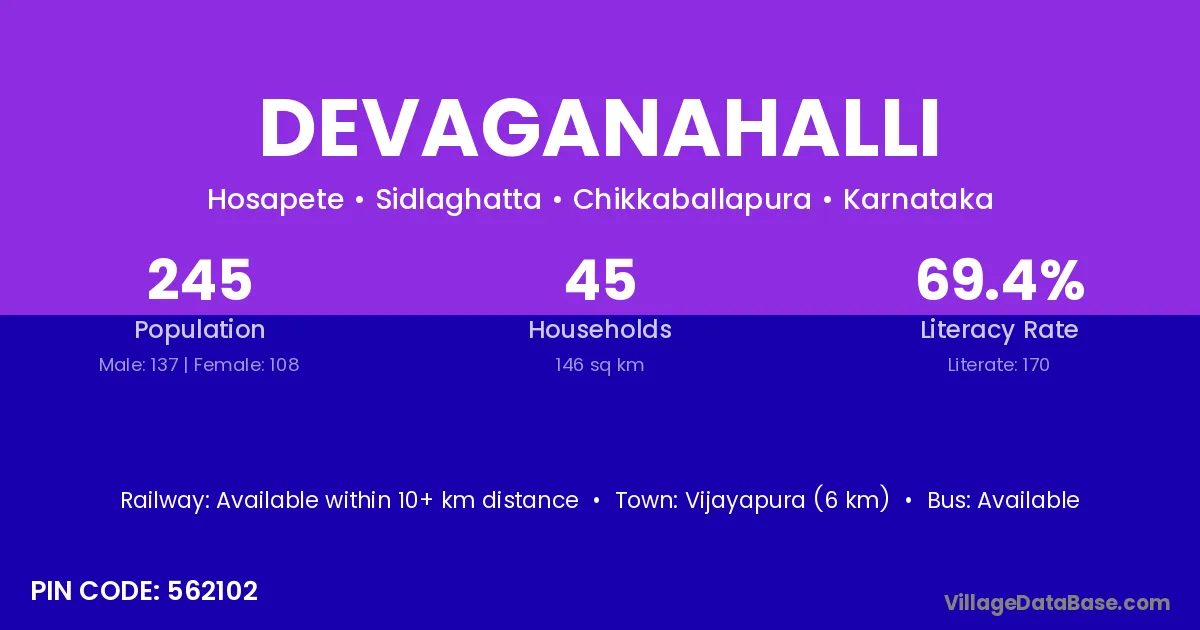 Vijayapura (6 km) is the nearest town to Devaganahalli village for major economic activities and is located approximately 6 km away.