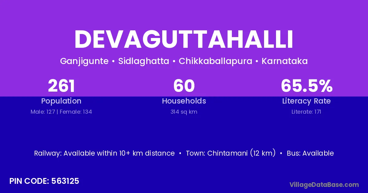 Chintamani (12 km) is the nearest town to Devaguttahalli village for major economic activities and is located approximately 12 km away.