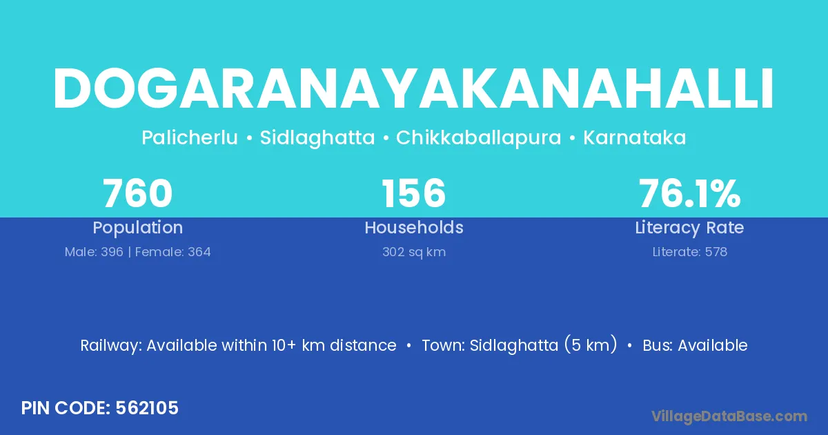 Sidlaghatta (5 km) is the nearest town to Dogaranayakanahalli village for major economic activities and is located approximately 5 km away.