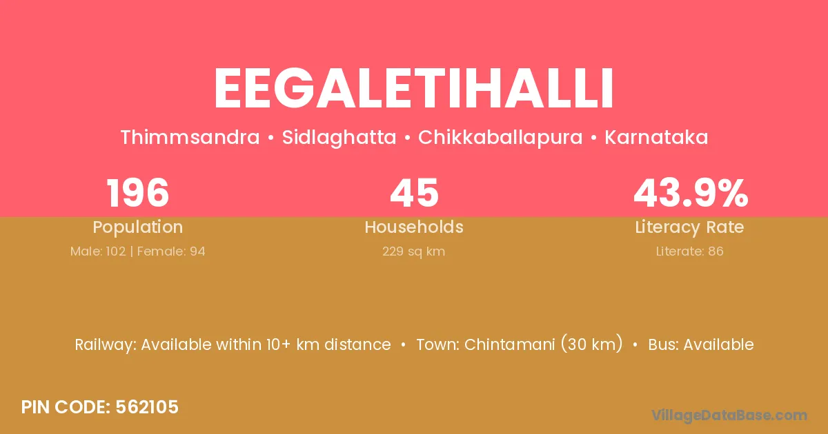 Chintamani (30 km) is the nearest town to Eegaletihalli village for major economic activities and is located approximately 30 km away.