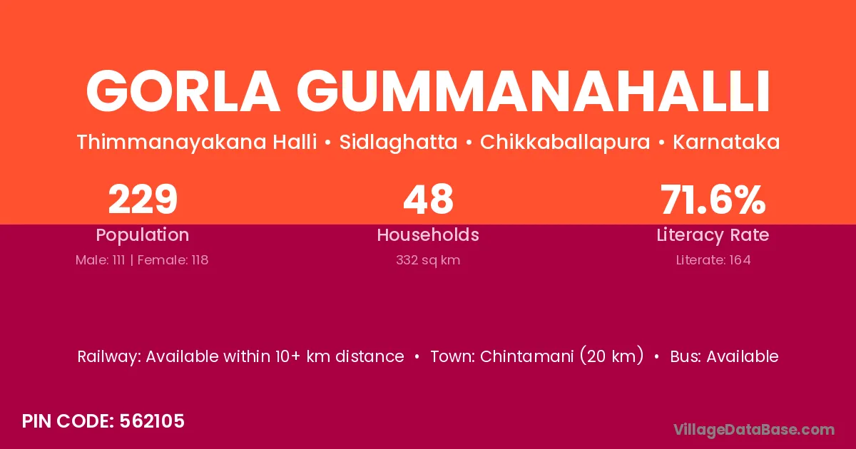 Gorla Gummanahalli village has a total population of 229 people, of which 111 are males and 118 are females.