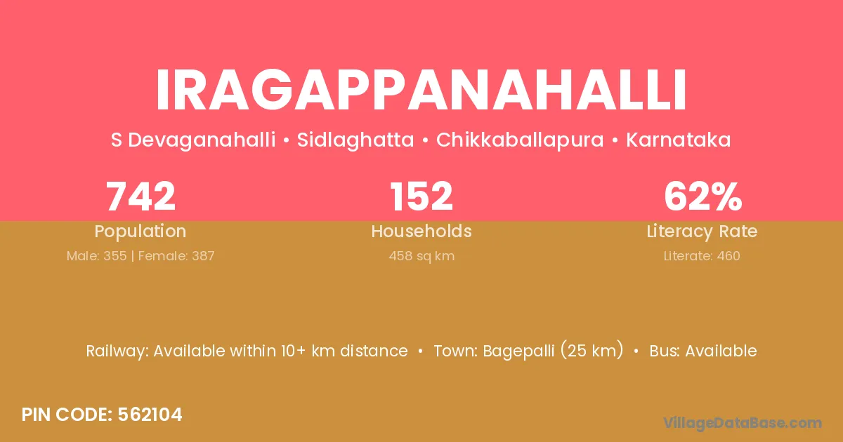 Iragappanahalli village has a total population of 742 people, of which 355 are males and 387 are females.