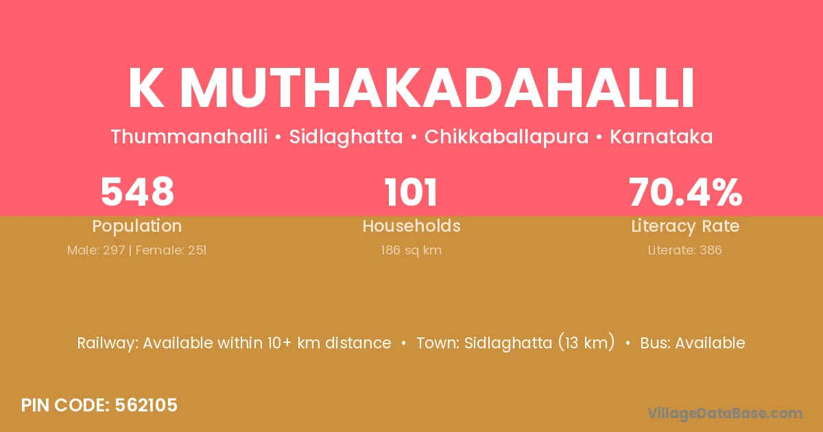 Sidlaghatta (13 km) is the nearest town to K Muthakadahalli village for major economic activities and is located approximately 13 km away.