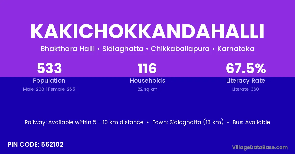 Sidlaghatta (13 km) is the nearest town to Kakichokkandahalli village for major economic activities and is located approximately 13 km away.