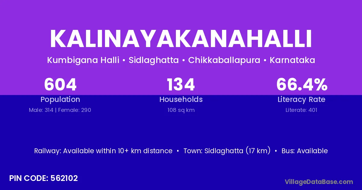 Sidlaghatta (17 km) is the nearest town to Kalinayakanahalli village for major economic activities and is located approximately 17 km away.