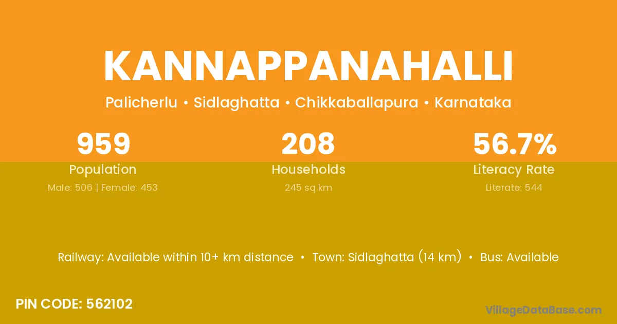 Kannappanahalli village has a total population of 959 people, of which 506 are males and 453 are females.
