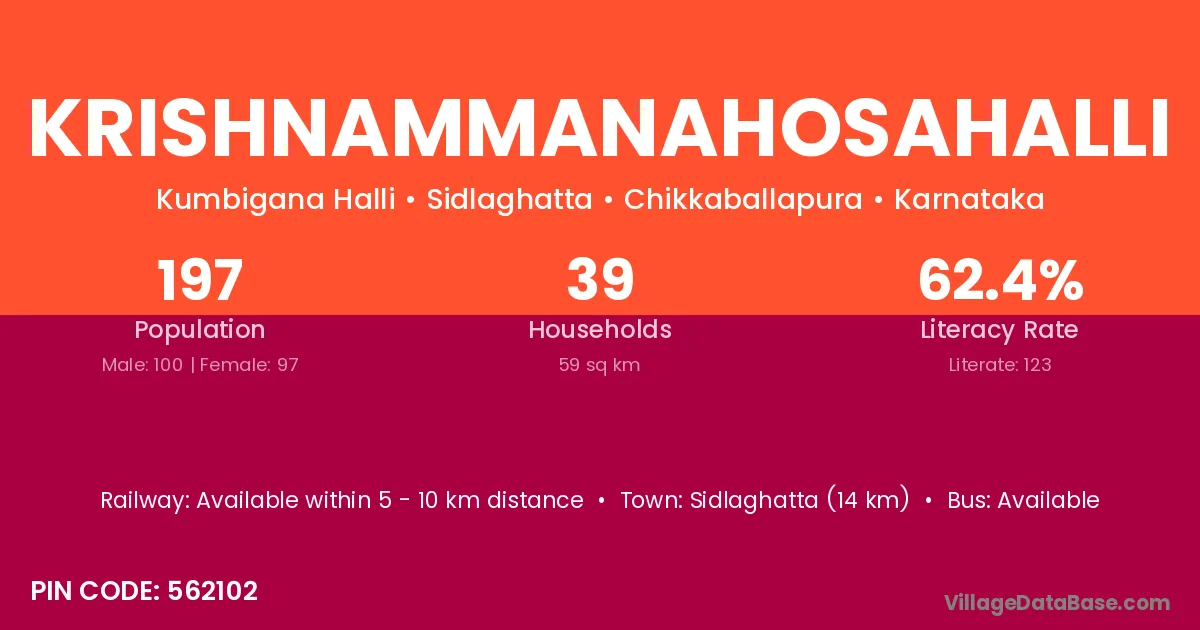 Sidlaghatta (14 km) is the nearest town to Krishnammanahosahalli village for major economic activities and is located approximately 14 km away.
