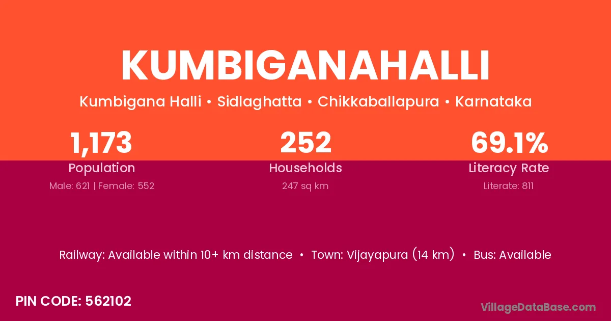 Vijayapura (14 km) is the nearest town to Kumbiganahalli village for major economic activities and is located approximately 14 km away.