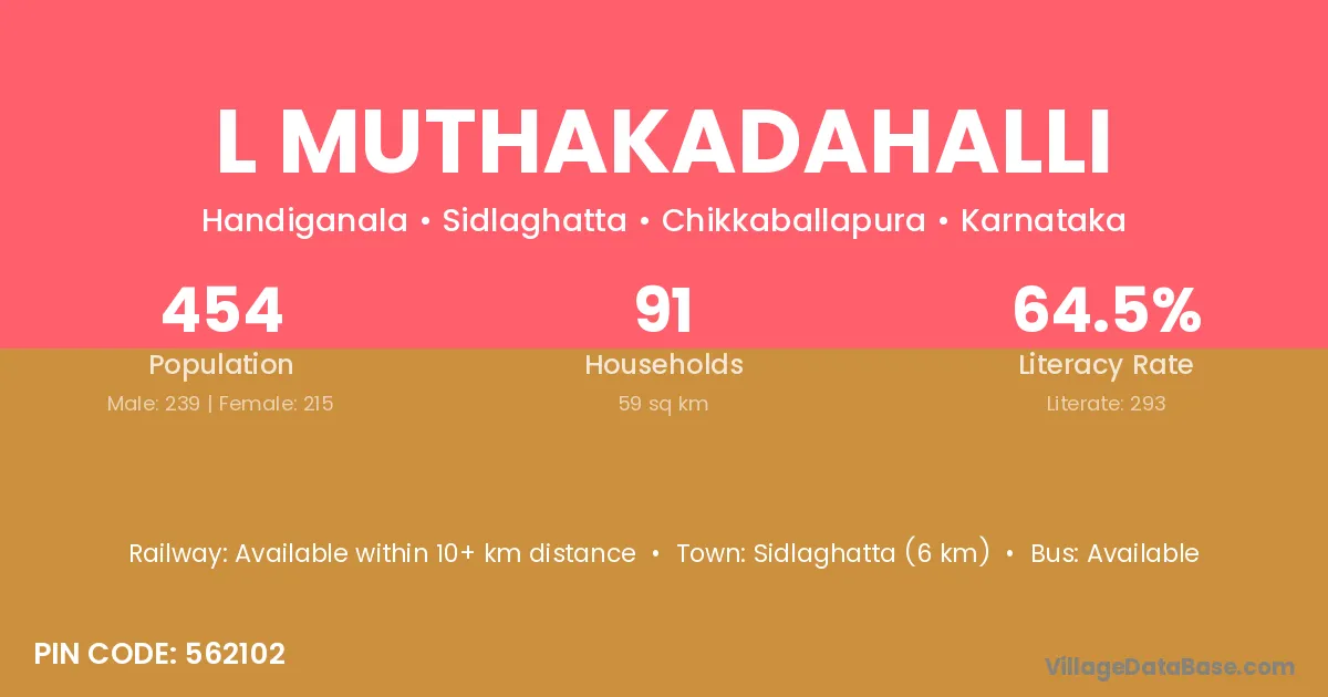 Sidlaghatta (6 km) is the nearest town to L Muthakadahalli village for major economic activities and is located approximately 6 km away.