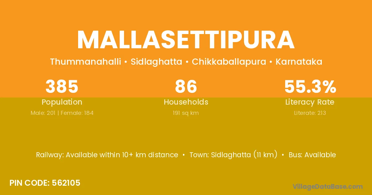 Sidlaghatta (11 km) is the nearest town to Mallasettipura village for major economic activities and is located approximately 11 km away.