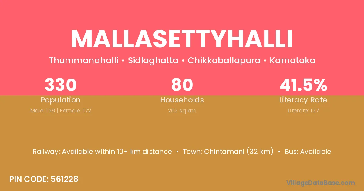 Chintamani (32 km) is the nearest town to Mallasettyhalli village for major economic activities and is located approximately 32 km away.