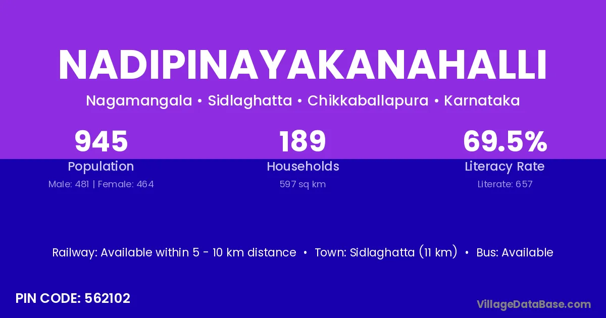 Sidlaghatta (11 km) is the nearest town to Nadipinayakanahalli village for major economic activities and is located approximately 11 km away.