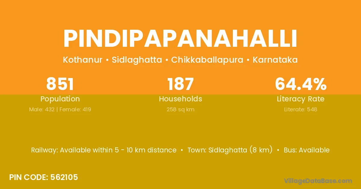 Sidlaghatta (8 km) is the nearest town to Pindipapanahalli village for major economic activities and is located approximately 8 km away.