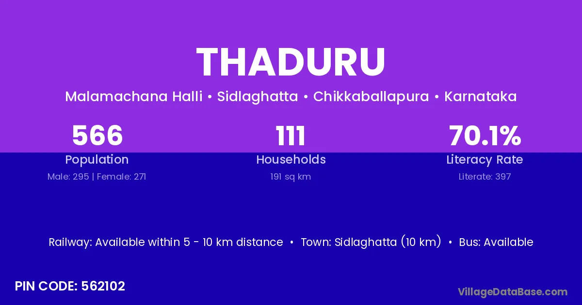 Sidlaghatta (10 km) is the nearest town to Thaduru village for major economic activities and is located approximately 10 km away.