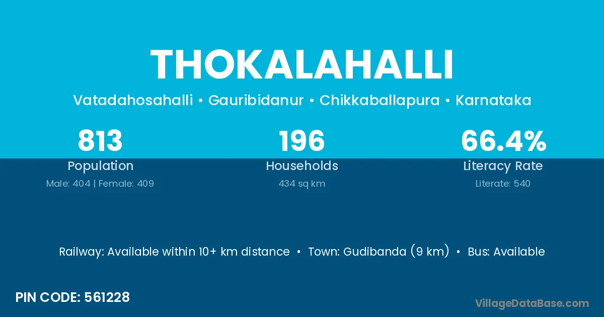 Sidlaghatta (20 km) is the nearest town to Thokalahalli village for major economic activities and is located approximately 20 km away.