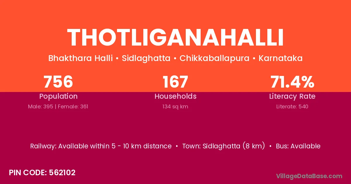 Sidlaghatta (8 km) is the nearest town to Thotliganahalli village for major economic activities and is located approximately 8 km away.