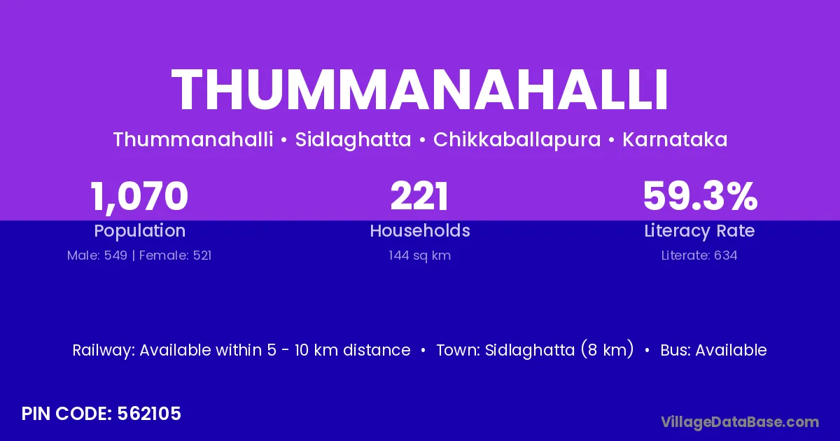 Sidlaghatta (8 km) is the nearest town to Thummanahalli village for major economic activities and is located approximately 8 km away.