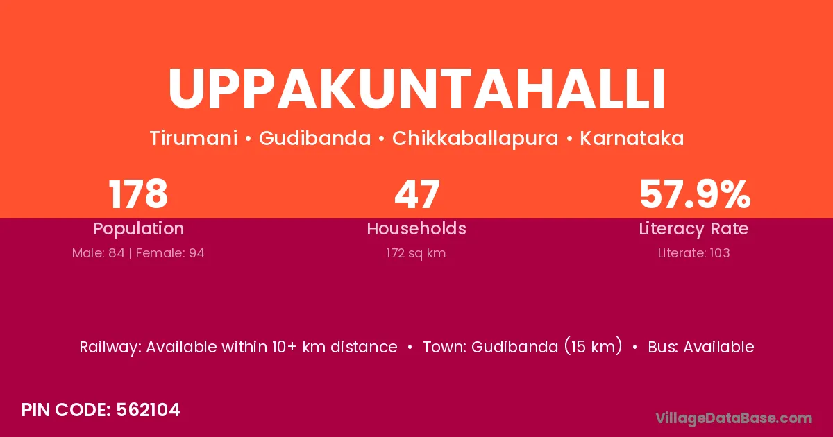 Chikkaballapur (32 km) is the nearest town to Uppakuntahalli village for major economic activities and is located approximately 32 km away.