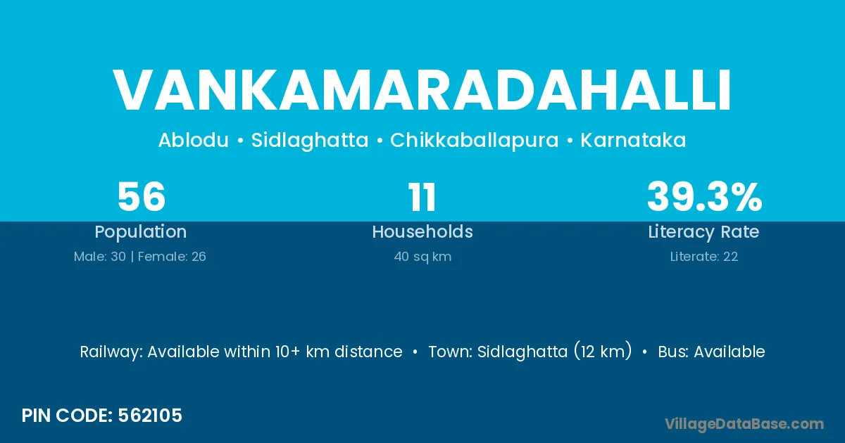 Sidlaghatta (12 km) is the nearest town to Vankamaradahalli village for major economic activities and is located approximately 12 km away.