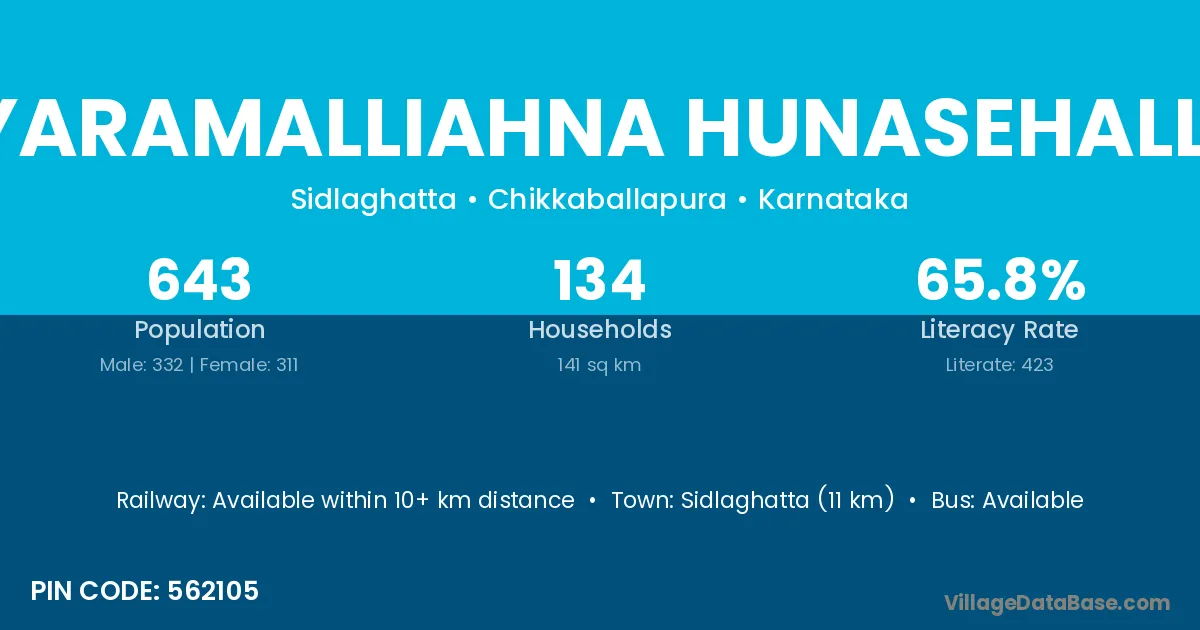 Yaramalliahna Hunasehalli village has a total population of 643 people, of which 332 are males and 311 are females.