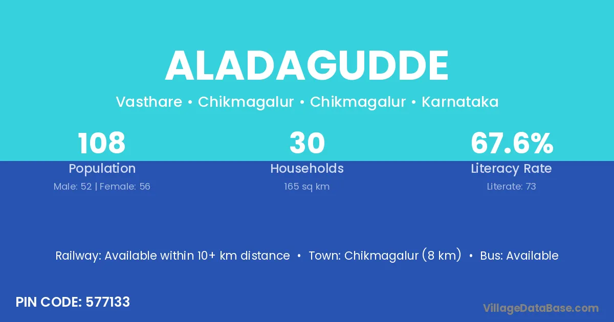 Aladagudde village has a total population of 108 people, of which 52 are males and 56 are females.