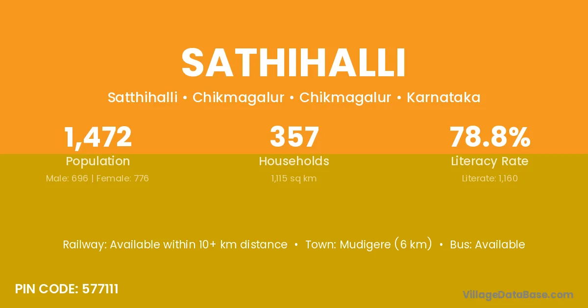 Mudigere (6 km) is the nearest town to Sathihalli village for major economic activities and is located approximately 6 km away.