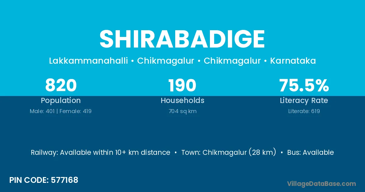 Chikmagalur (28 km) is the nearest town to Shirabadige village for major economic activities and is located approximately 28 km away.