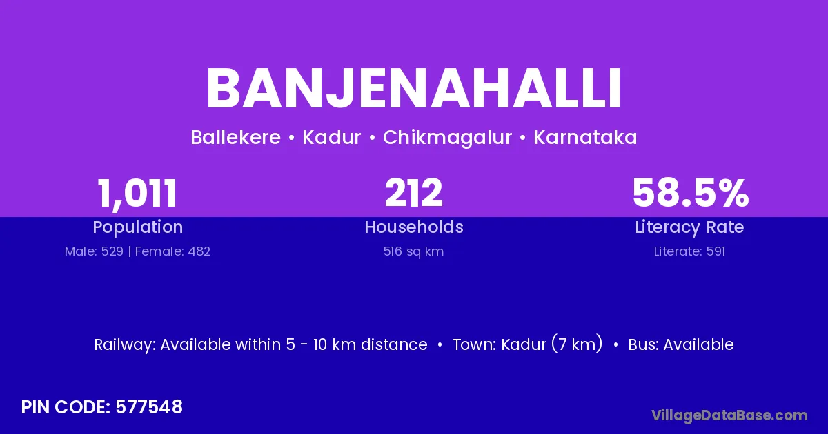 Kadur (7 km) is the nearest town to Banjenahalli village for major economic activities and is located approximately 7 km away.