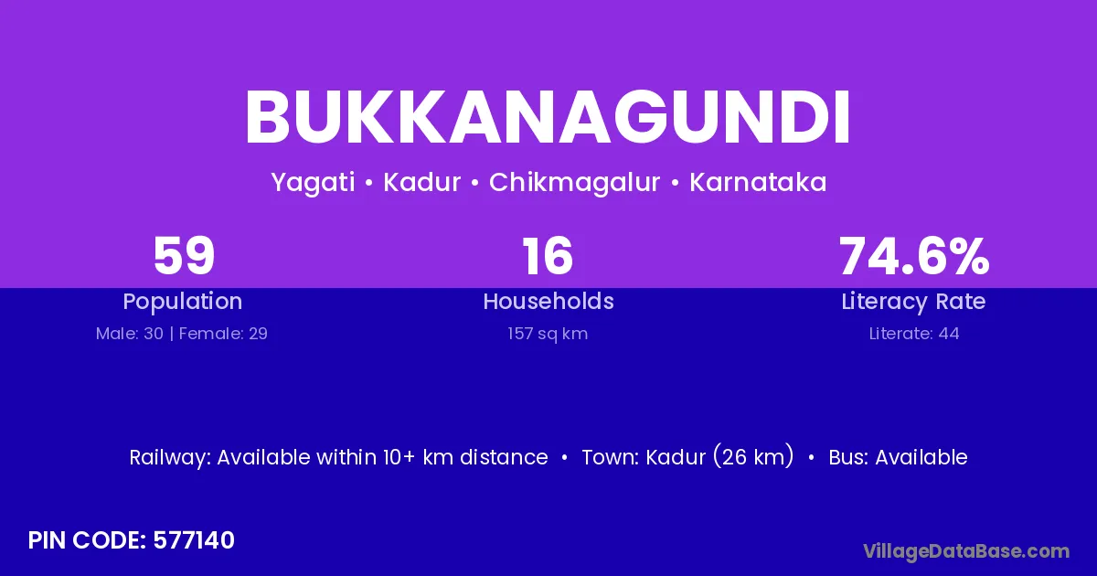 Kadur (26 km) is the nearest town to Bukkanagundi village for major economic activities and is located approximately 26 km away.