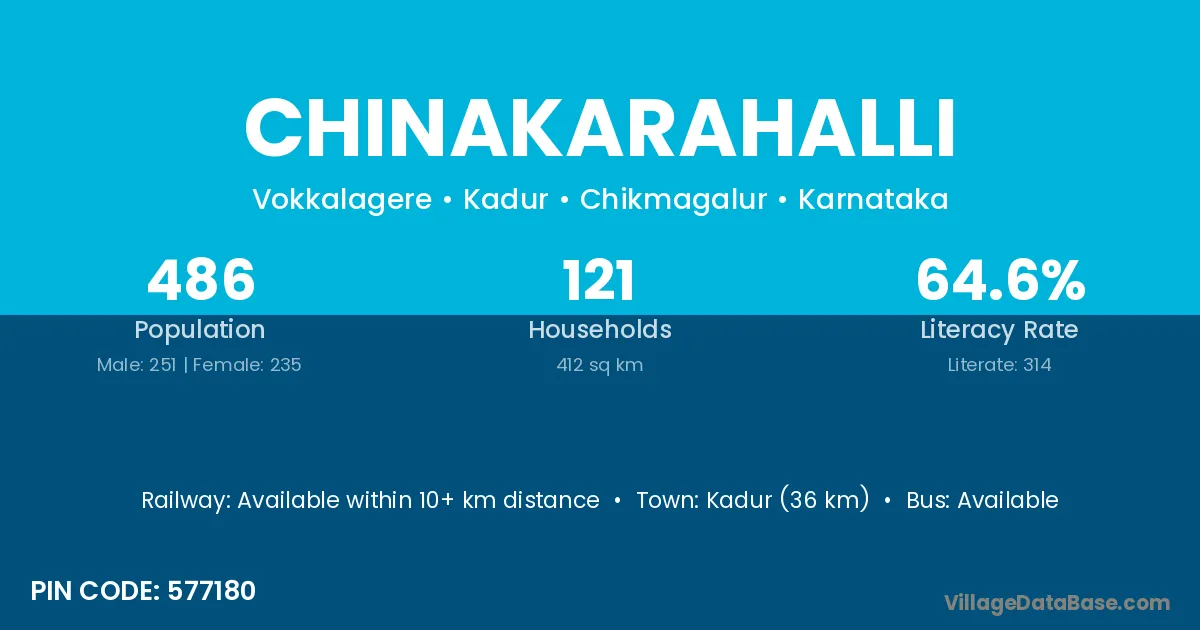 Kadur (36 km) is the nearest town to Chinakarahalli village for major economic activities and is located approximately 36 km away.