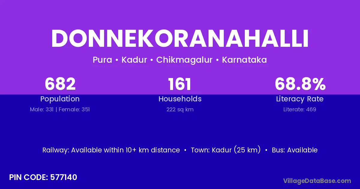 Kadur (25 km) is the nearest town to Donnekoranahalli village for major economic activities and is located approximately 25 km away.